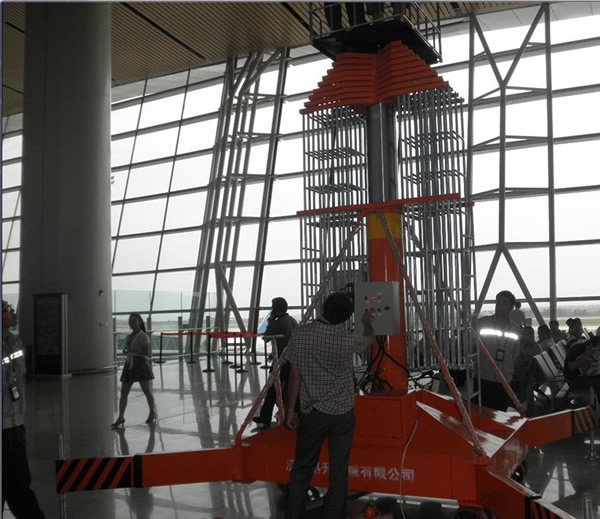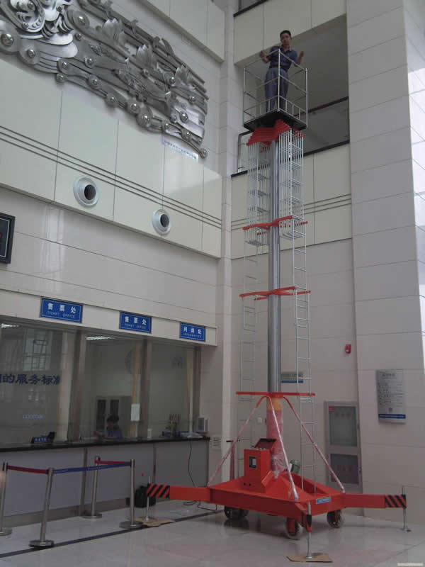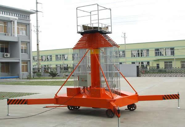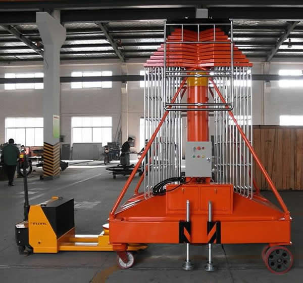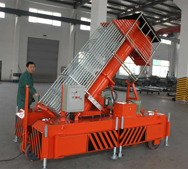 套缸式升降平臺具有設計新穎,體積小,外型美觀,操作維修方便,升降平穩(wěn)等優(yōu)點。整機由平臺、伸縮油缸、單梯式或雙梯式防轉(zhuǎn)機構、底盤油箱、支腿、行走輪等組成。平臺由伸縮油缸直接頂升,當啟動電機時,由電機帶動齒輪泵供油,油液經(jīng)單向閥及電磁通道輸入油缸,伸縮油缸則逐節(jié)上升,當平臺升到最大高度時,系統(tǒng)壓力也就達到了額定工作壓力。